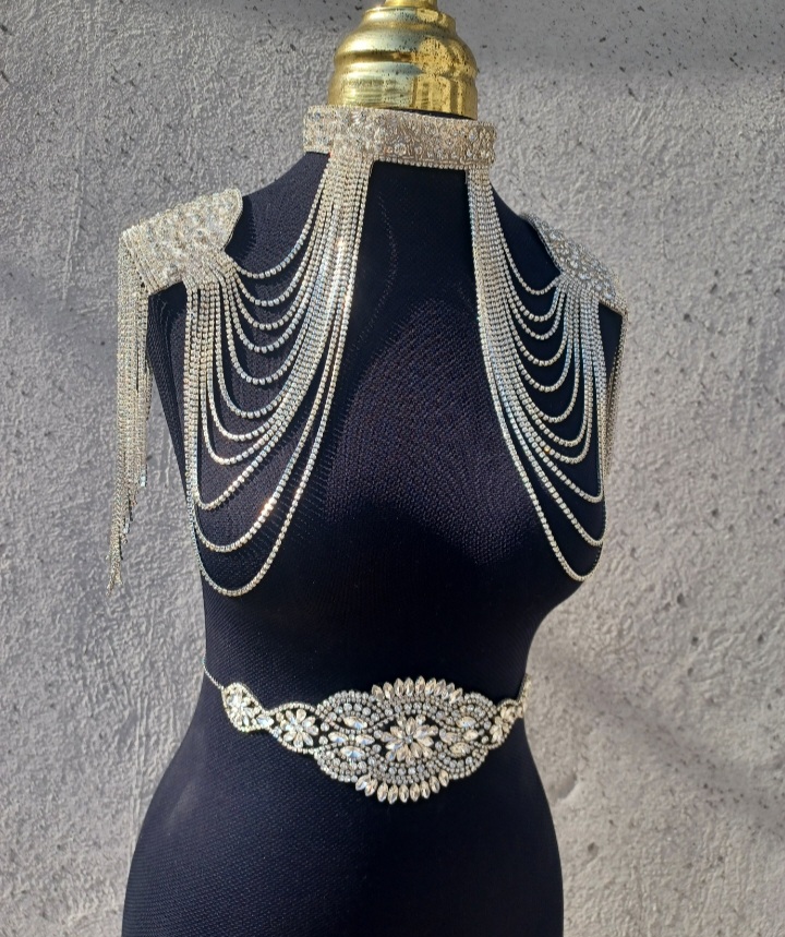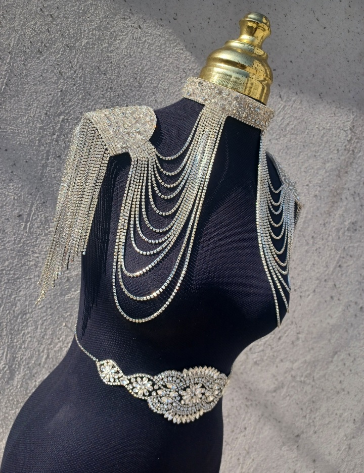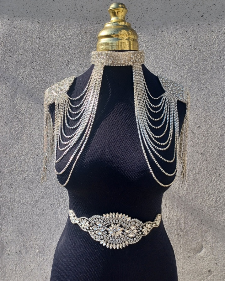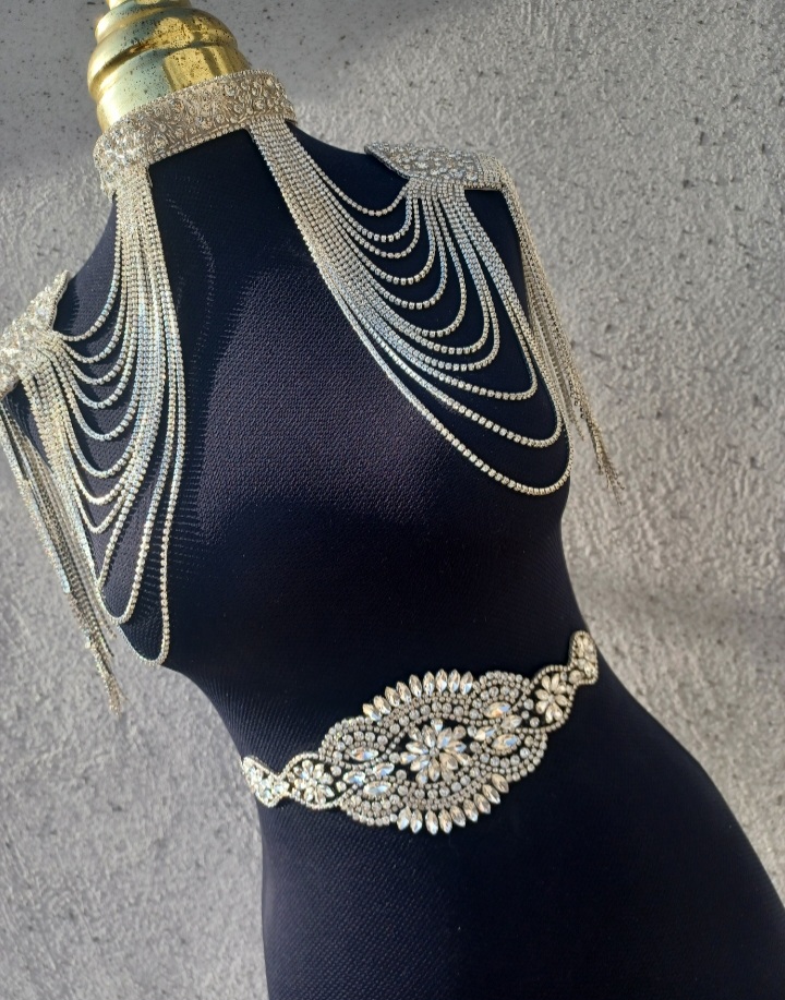 ست+گردن اویز+کمربند +نگینی+ نقره ای